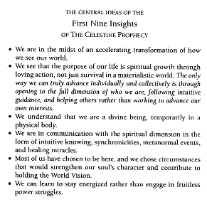 #1. Feeling restless? You're not alone: Everybody's starting to look for more meaning in life. Start paying closer attention to those seemingly "Chance Coincidences" - strange occurrences that feel like they were meant to happen. They are actually synchronistic events, and following them will start you on your path to spiritual truth.- Alan Atkisson, New Age Journal, August, 1994#2. Observe our culture within its proper historical context. The first half of the past millennium was spent under the thumb of the church; in the second half we became preoccupied with material comfort. Now, at the end of the twentieth century, we've exhausted that preoccupation. We're ready to discover life's ultimate purpose.