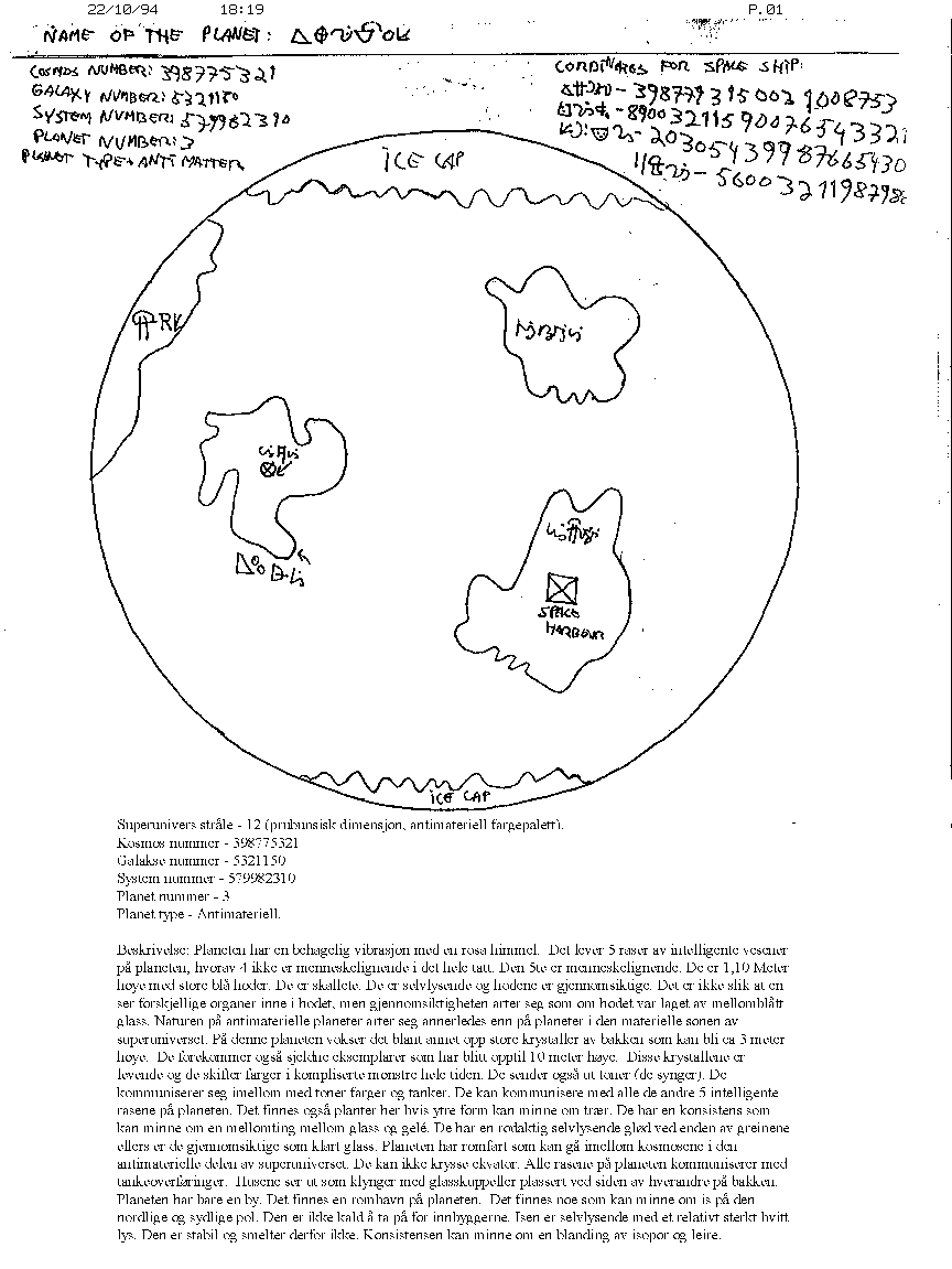| Beskrivelse: Denne planeten ligger en bane utenfor den planet som ble beskrevet før.Den har en aksehelning på ca 25 grader.Den har derfor årstider. På den nordlige halvkule er det ikke land der hvor snøen forekommer om vinteren.På den sydlige halvkule er det et stort kontinent hvor de sydligste delene dekkes av snø om vinteren.Vannet i havet er saltvann slik som på Jorden.Planeten er rik på metaller spesielt Jern og kopper.Planeten har 7 naturplan langs den engoniske akse hvorav de 2 øverste er 4 dimensjonale. Disse naturplan har ikke noe forbindelse med hverandre.For å komme mellom planetens naturplan må en bruke romskip som kan bevege seg engonisk. Det naturplan som kan sammenlignes med humpnap ligger på en noe lavere frekvens enn humpnap.Dette er planetens plan 1.Her finnes det store bygninger av brun stein uten vinduer med en liten dør nederst.De er trapesformede og kubiske.De er etterlevninger etter en tidligere sivilisasjon som planetens nåværende innbyggere ikke vet noe om.Arkitekturen minner endel om arkitekturen i nåværende Jordiske byer bygget på 1950 tallet.En kan si at den har en funksjonalistisk stil.Den viktigste næringsvei på planeten er gruvedrift på Jern og kopper samt stålproduksjon.På grunn av gruvedriften på kopper har planetens 2 store innskjøer blitt forurenset med kopperholdig materiale.Det er derfor problemer med å skaffe drikkevann.Sivilisajonen ligger teknisk sett noe over nivået til den Jordiske sivilisasjon regnet ut fra 1990 nivå.Innen år 2000 vil vi sansylig passere det teknologiske nivå på Kobolts naturplan 1 med hensyn til komputerteknikk. De har romfart som kan benytte seg av energier på energiplan 2.De har ikke romfartsteknologi som kan klare intergalaktisk romfart.Planeten motar ofte besøk fra andre planeter,og de har en romhavn som brukes til dette.Transportmiddelet er en type tog som svever på et sterkt magnetfelt over en magnetisk skinne.Det kan komme opp i ca 1000 Km/time.Disse skinnene går på kryss og tvers av planetens store kontinenter.Planeten får sin elektriske energi fra ITM basserte kraftstasjoner.De har ikke atomkraft.ca 1/4 av andromeda galaksen er tilgjengelig for deres romfart.De har ikke biler og veier.De basserer den personlige transport på svevefartøyer med superledene spoler som frastøter planetens naturlige magnetfelt.Planetens magnetfelt brukes da til å løfte opp fartøyet slik at det svever over bakken.De kan ikke komme til andre planeter med disse transportmidlene da de mister løftet utenfor planetens magnetfelt.Utesende messig ligner kroppen på Jordmenneskene med untaket av hodet som har en annen form.Hudfargen er blågrønn.Det finnes store barskoger på planeten,med pattedyr som ligner på Elg og Hjort.Det finnes ikke blomster. Derfor har de laget kunstig blomster av metall som de har malt og utlassert i sine by parker.Det finnes heller ikke fugler her. Sivilisasjonen på naturplan 3 til 7 ligger på et høyere nivå med hensyn til kontakt med den galaktiske sivilisasjon. |