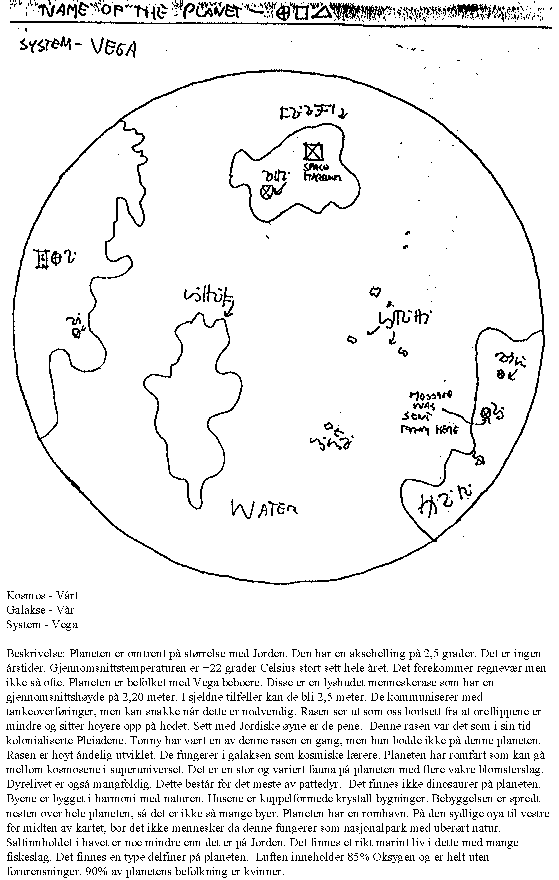 | Beskrivelse: Planeten er omtrent på størrelse med Jorden.Den har en aksehelling på 2,5 grader.Det er ingen årstider.Gjennomsnittstemperaturen er +22 grader Celsius stort sett hele året.Det forekommer regnevær men ikke så ofte.Planeten er befolket med Vega beboere.Disse er en lyshudet menneskerase som har en gjennomsnittshøyde på 2,20 meter.I sjeldne tilfeller kan de bli 2,5 meter.De kommuniserer med tankeoverføringer,men kan snakke når dette er nødvendig.Rasen ser ut som oss bortsett fra at øreflippene er mindre og sitter høyere opp på hodet.Sett med Jordiske øyne er de pene. Denne rasen var det som i sin tid kolonialiserte Pleiadene.(Navn 5) har vært en av denne rasen en gang,men hun bodde ikke på denne planeten. Rasen er høyt åndelig utviklet.De fungerer i galaksen som kosmiske lærere. Planeten har romfart som kan gå mellom kosmosene i superuniverset. Det er en stor og variert fauna på planeten med flere vakre blomsterslag. Dyrelivet er også mangfoldig.Dette består for det meste av pattedyr. Det finnes ikke dinosuruser på planeten.Byene er bygget i harmoni med naturen.Husene er kuppelformede krystall bygninger.Bebyggelsen er spredt nesten over hele planeten,så det er ikke så mange byer.Planeten har en romhavn.På den sydlige øya til vestre for midten av kartet,bor det ikke mennesker da denne fungerer som nationalpark med uberørt natur.Saltinnholdet i havet er noe mindre enn det er på Jorden.Det finnes et rikt marint liv i dette med mange fiskeslag.Det finnes en type delfiner på planeten. Luften inneholder 85% Oksygen og er helt uten forurensinger. 90% av planetens befolkning er kvinner. |